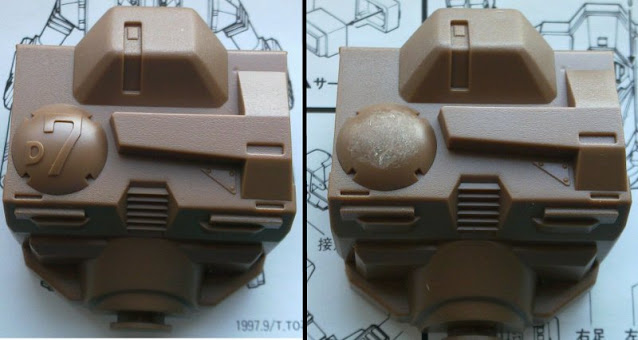 While I was fooling around I attached the hip to the torso as I was done with airbrushing, there was no longer a need to keep them separated. Until I'm done with the logos, I'll keep the legs separately, for convenience and simplicity.
