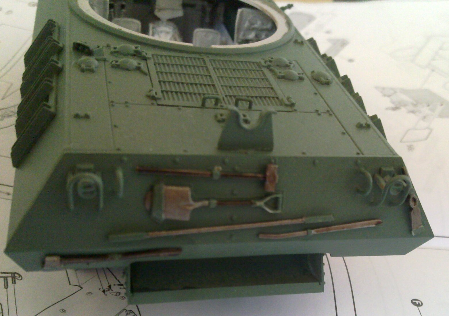 The tools that got installed on the rear plate got a simple, basic treatment. I painted the wooden handles with Vallejo's Charred Brown, the metallic surfaces with Vallejo's Oily Steel. Any parts that looked like they were a part of the tank (holders and such) got the same Vallejo's Panzer Olive Green as the rest of the tank. After all that had dried I applied a wash of Citadel's Devlan Mud. To finish all this with a huge surprise I glued all the pieces to their places.