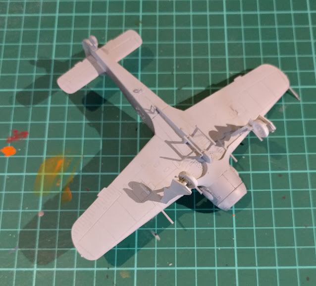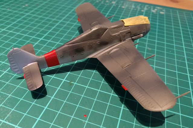 For a change I decided to prime the model white. That Vallejo's Grey Surface Primer I've been using has been a bit weird lately. Afterwards I realized that I had forgotten to prime the drop tank. This happens quite a lot.The pattern
