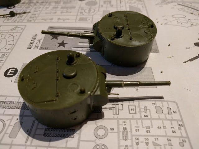 Then I got to glue a pretty amusing-looking setup to hold all the previous bits in place. Had this been a Kraut wagon, it'd been used to hang some Schürzen, but as this was a Soviet crawler...