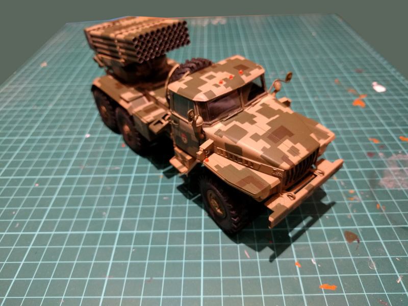 Even though the digital camouflage is not a new idea, it's gotten some wider use pretty recently. Against that background the Ukrainian happenings were a very fitting match for this project. Also, the Guards emblems on the doors matched (well enough) those that have supposedly been sighted* in there, although on somewhat heavier and more modern launchers. Maybe the 438th Guards Rocket Artillery Brigade had a couple of older BM-21 launchers just waiting to be used and they didn't have enough GPS/ГЛОНАСС equipment to go around. So they could easily claim that the Grad had just gotten temporarily confused about its whereabouts and so ended up in the wrong side of the border...