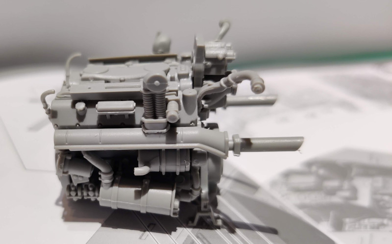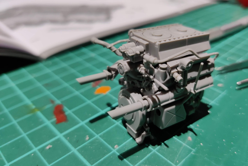 Being asymmetric the motor's second upper corner wasn't much quicker than the first one. Here a sickening amount of all kinds of weird lumps, ducts, pipes and narrower pipes were glued to live next to each other. Everything had to be set in place based on fancy 3d drawings and how the next step looked like in the instructions (or in the painting guide), and also by gut feeling. Personally I'd really appreciated clearer images and/or pieces that didn't make you guess if they were properly aligned.